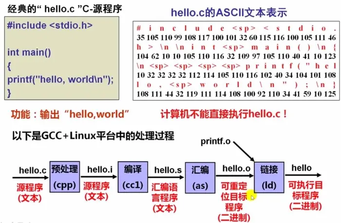 .c 文件首先经过预处理,包含头文件和定义,形成.i 源文件,然后通过编译为汇编语言.s 文件,接着通过汇编程序形成.o 可重定向目标程序,最后再与其他.o 文件链接形成可执行目标程序.exe 文件